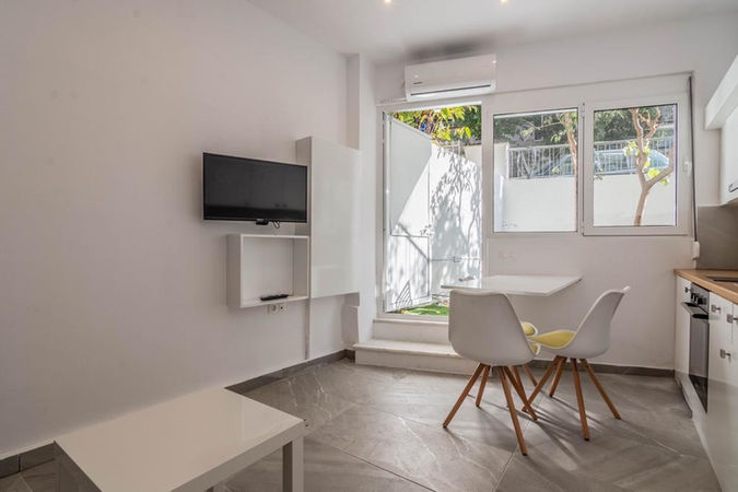 A semi-ground level studio, 17.50m², in Ano Patisia, renovated in 2019, one minute by foot from metro station, fully furnished.